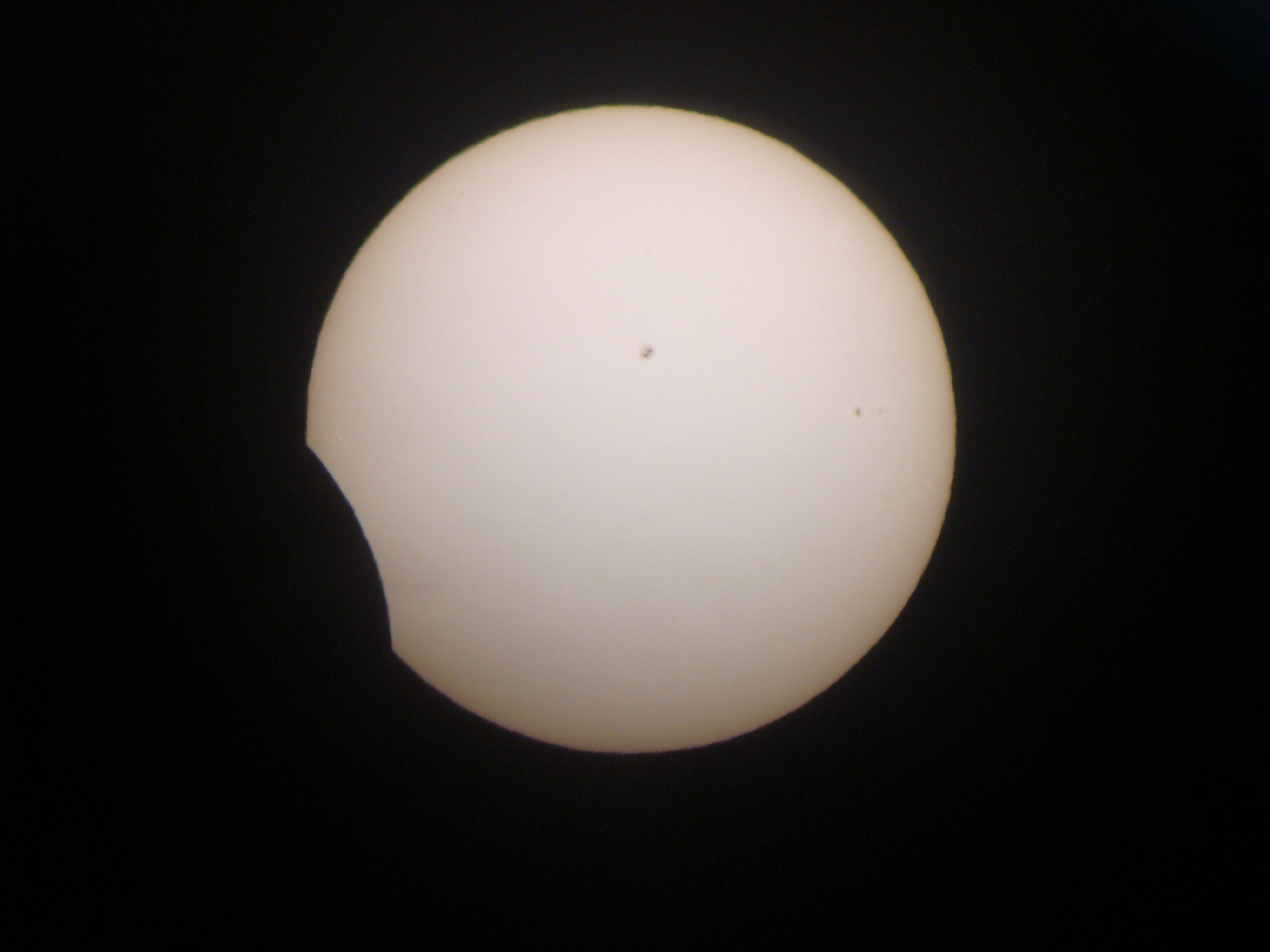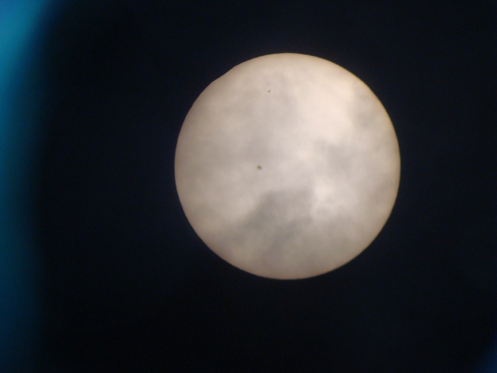 I have a little 16 mp Sony Cyber Shot camera, that I made a contraption for, that allows me to secure it to an eyepiece in a telescope. I’ve taken numerous pics with this little rig, it works. Speaking of pics… This was my first one of the day, just to make sure things were working. You can see some sun spots, and the focus isn’t great. It looked decent through the eyepiece, but I was battling lots, and lots, of clouds, often being totally obscured, and the seeing was terrible. Even when it seemed clear there were wispy clouds in the way almost 100% of the time. But I persevere. EDIT: These pics will enlarge if you click on them.